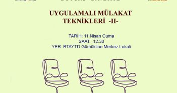 UYGULAMALI MÜLAKAT TEKNİKLERİ -II- Batı Trakya Azınlığı Yüksek Tahsilliler Derneği bünyesinde faaliyet gösteren Mesleki Tanıtımve Rehberlik Kolu, lise öğrencilerine yönelik “Uygulamalı Mülakat Teknikleri” konulusunumun ikinci oturumunu aşağıda verilen tarihte gerçekleştirecektir.Etkinliğe tüm öğrenciler davetlidir.Tarih: 11 Nisan Cuma 2025Saat: 12.30Yer: Batı Trakya Azınlığı Yüksek Tahsilliler Derneği Gümülcine Merkez Lokali