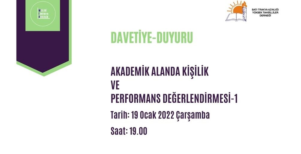 Batı Trakya Azınlığı Yüksek Tahsilliler Derneği bünyesinde faaliyet gösteren Mesleki Tanıtım ve Rehberlik Kolu, lise öğrencilerine yönelik “Akademik Alanda Kişilik ve Performans Değerlendirmesi-1” konulu çevrimiçi sunumun gerçekleştirecektir. Etkinliğe tüm öğrenciler davetlidir.
