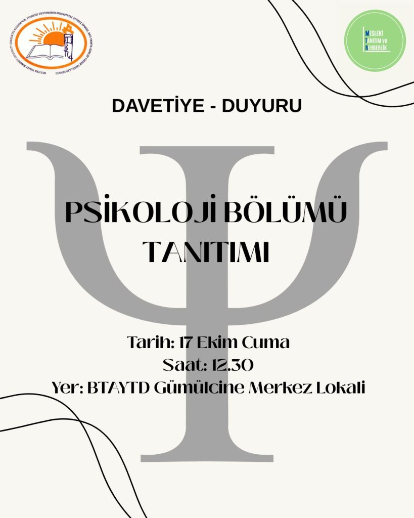Duyurular Fotoğraflar Haberler DAVETİYE – DUYURU By BTAYTD BTAYTD Ekim 16, 2025 0 Share Facebook Twitter Google+ Pinterest LinkedIn Email Batı Trakya Azınlığı Yüksek Tahsilliler Derneği bünyesinde faaliyet gösteren Mesleki Tanıtım ve Rehberlik Kolu, öğrencilere yönelik “Psikoloji” bölümünün tanıtımını gerçekleştirecektir. Etkinliğe tüm öğrenciler davetlidir. Tarih: 17 Ekim Cuma Saat: 12.30 Yer: BTAYTD Gümülcine Merkez Lokali