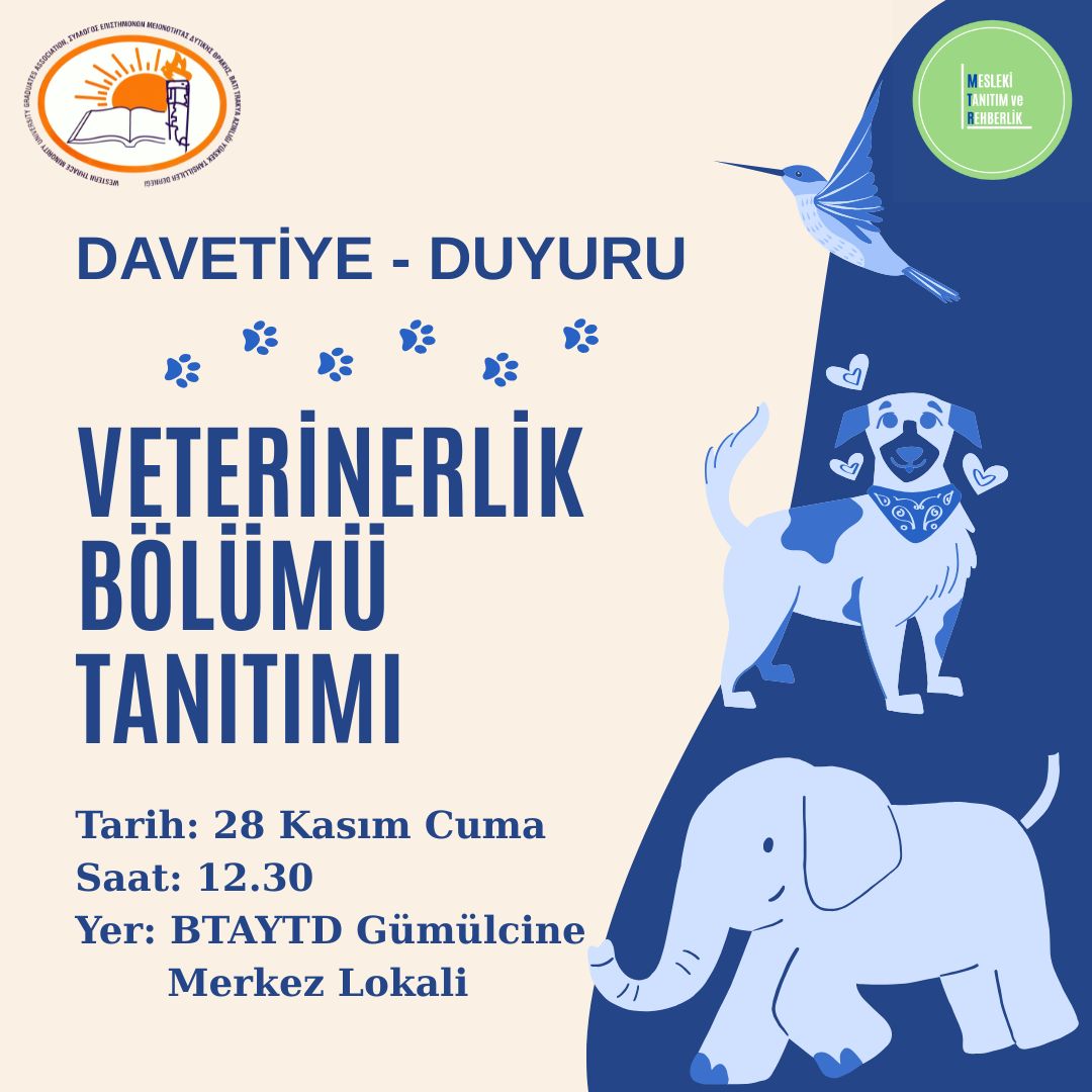 Duyurular Fotoğraflar DAVETİYE – DUYURU By BTAYTD BTAYTD Kasım 27, 2025 0 Share Facebook Twitter Google+ Pinterest LinkedIn Email Batı Trakya Azınlığı Yüksek Tahsilliler Derneği bünyesinde faaliyet gösteren Mesleki Tanıtım ve Rehberlik Kolu, öğrencilere yönelik “Veterinerlik” bölümünün tanıtımını gerçekleştirecektir. Etkinliğe tüm öğrenciler davetlidir. Tarih: 28 Kasım Cuma Saat: 12.30 Yer: BTAYTD Gümülcine Merkez Lokali