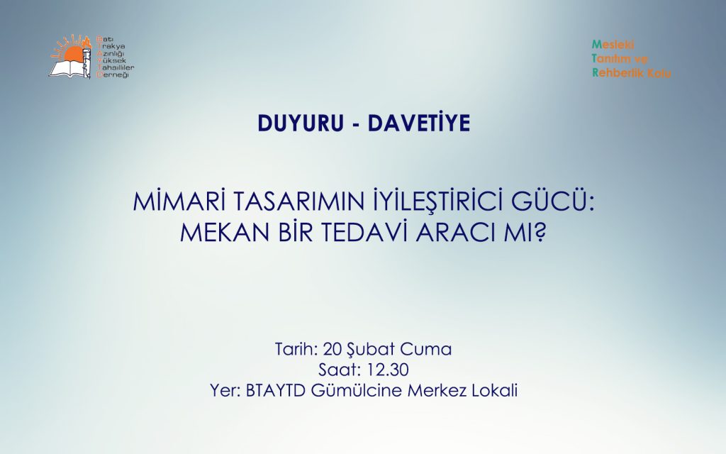 Batı Trakya Azınlığı Yüksek Tahsilliler Derneği bünyesinde faaliyet gösteren Mesleki Tanıtım ve Rehberlik Kolu, Kişisel Gelişim Atölyesi çerçevesinde “Mimari tasarımın iyileştirici gücü: mekan bir tedavi aracı mı?” konulu çalışma gerçekleştirecektir.Etkinliğe tüm öğrenciler davetlidir. Tarih: 20 Şubat Cuma Saat: 12:30 Yer: BTAYTD Gümülcine Merkez Lokali