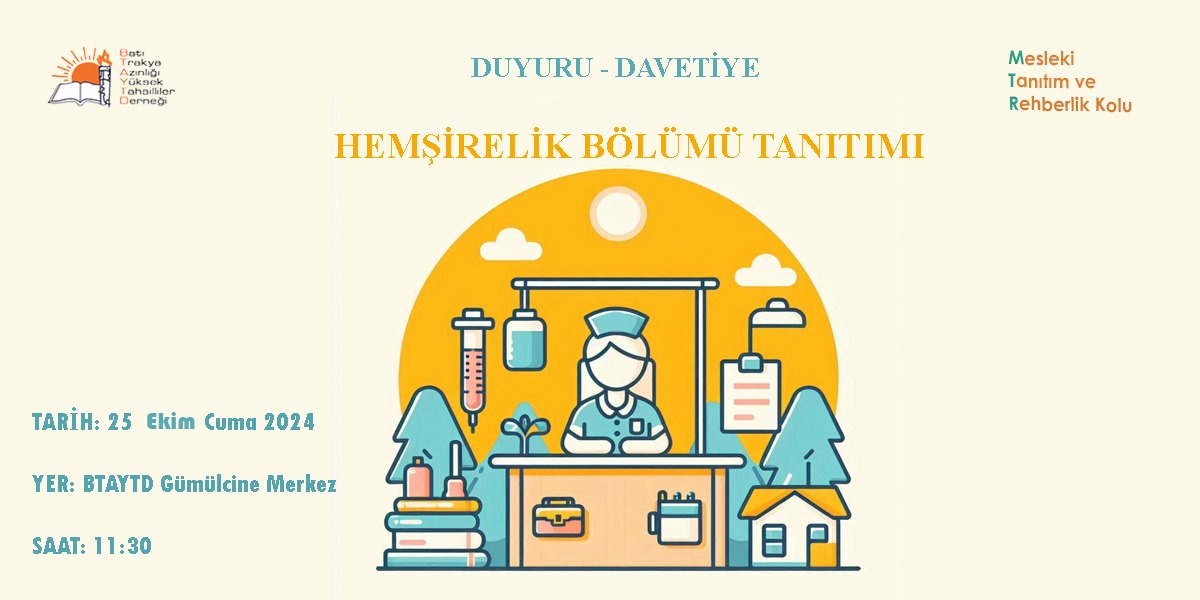 Batı Trakya Azınlığı Yüksek Tahsilliler Derneği bünyesinde faaliyet gösteren Mesleki Tanıtım ve Rehberlik Kolu, lise öğrencilerine yönelik “Hemşirelik” konulu bölüm tanıtımı gerçekleştirecektir.