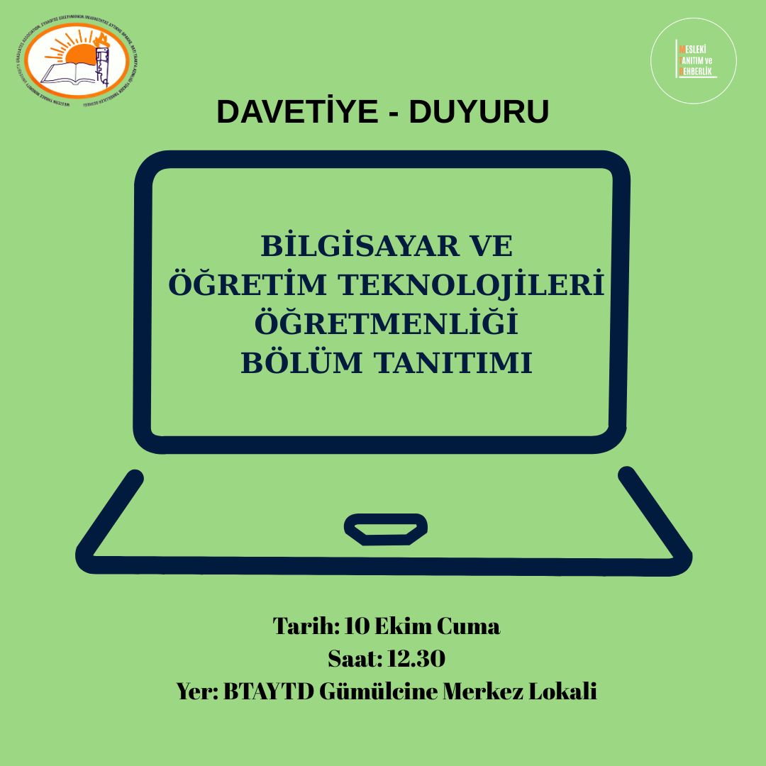 Batı Trakya Azınlığı Yüksek Tahsilliler Derneği bünyesinde faaliyet gösteren Mesleki Tanıtım ve Rehberlik Kolu, lise öğrencilerine yönelik “Bilgisayar ve Öğretim Teknolojileri Öğretmenliği” bölümünün tanıtımını gerçekleştirecektir.Etkinliğe tüm öğrenciler davetlidir.